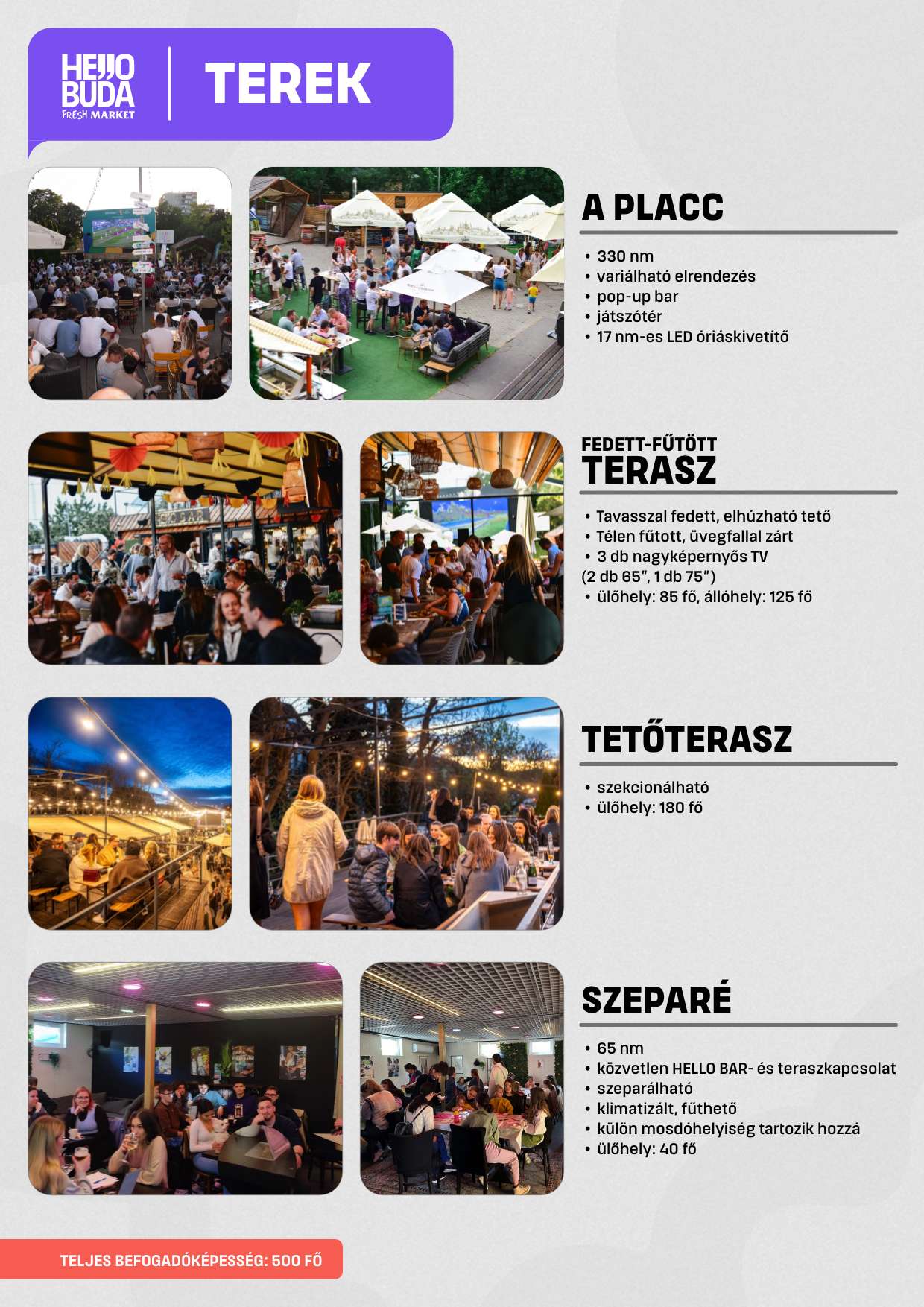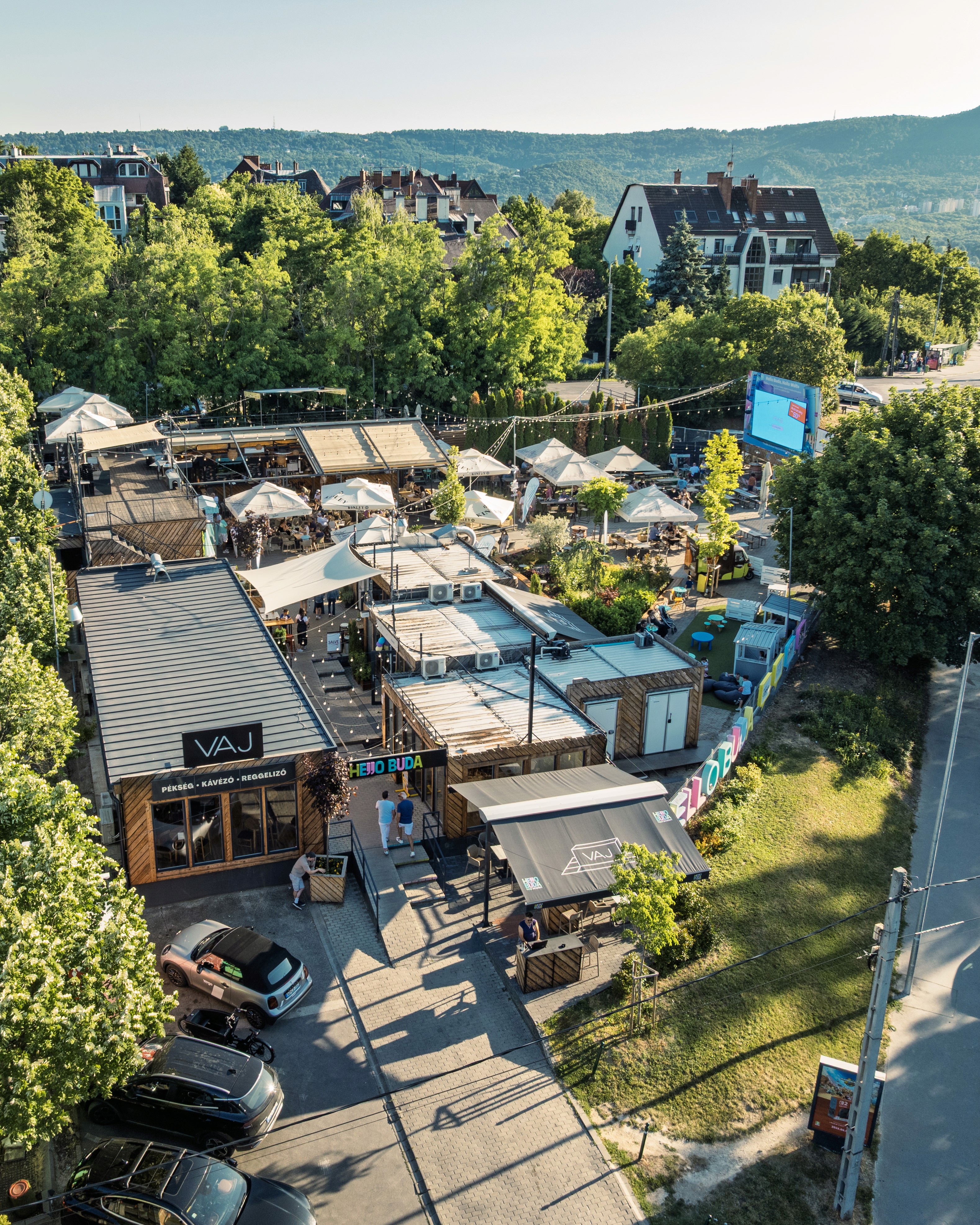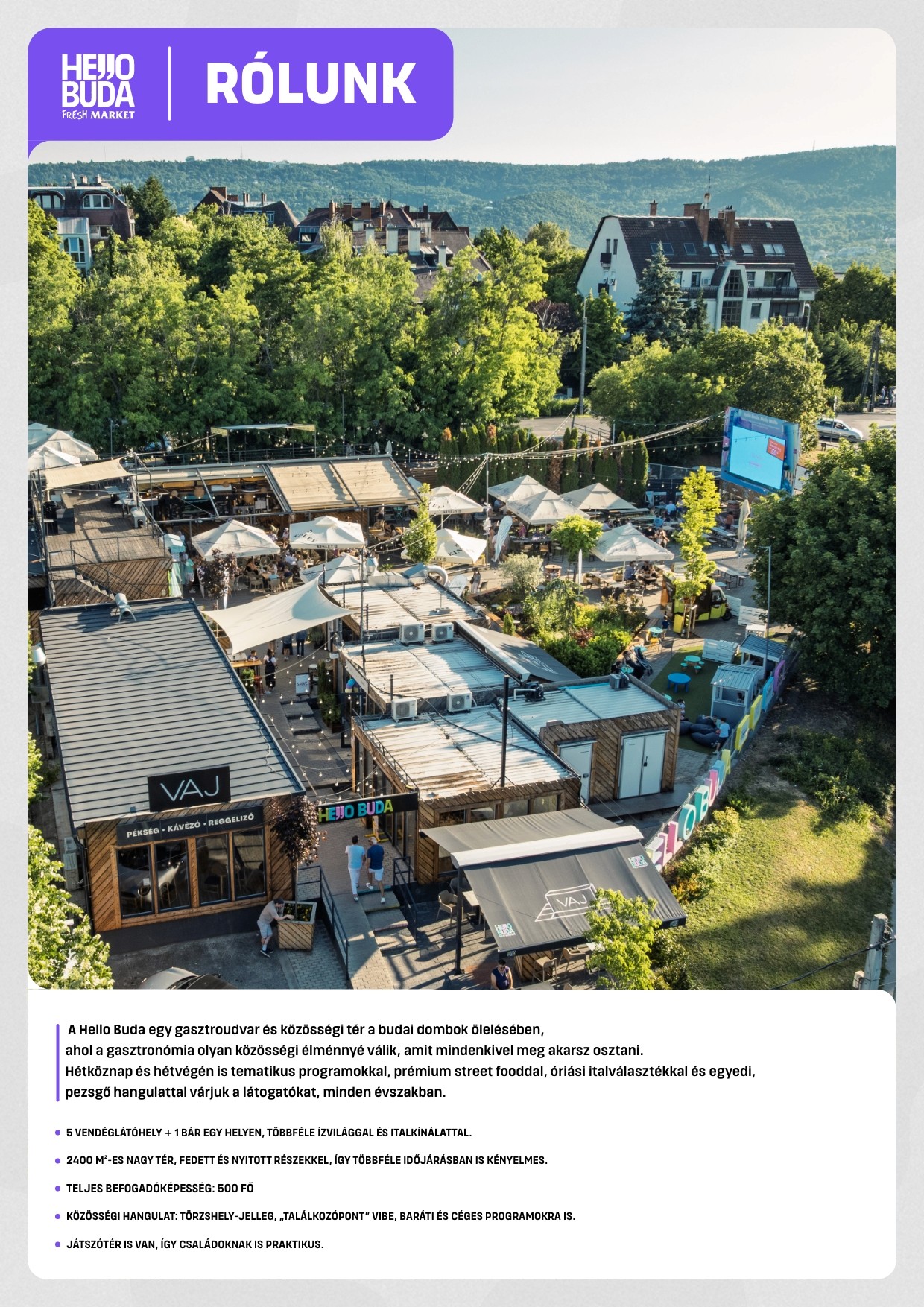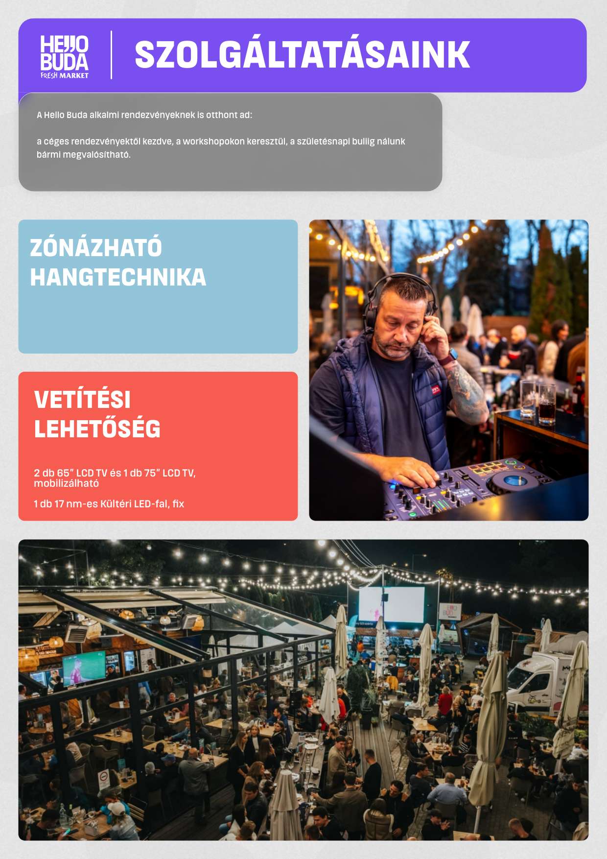 Variálható, elkülöníthető belső és külső terek, egyedi gasztroudvar-hangulat, könnyű szervezés.